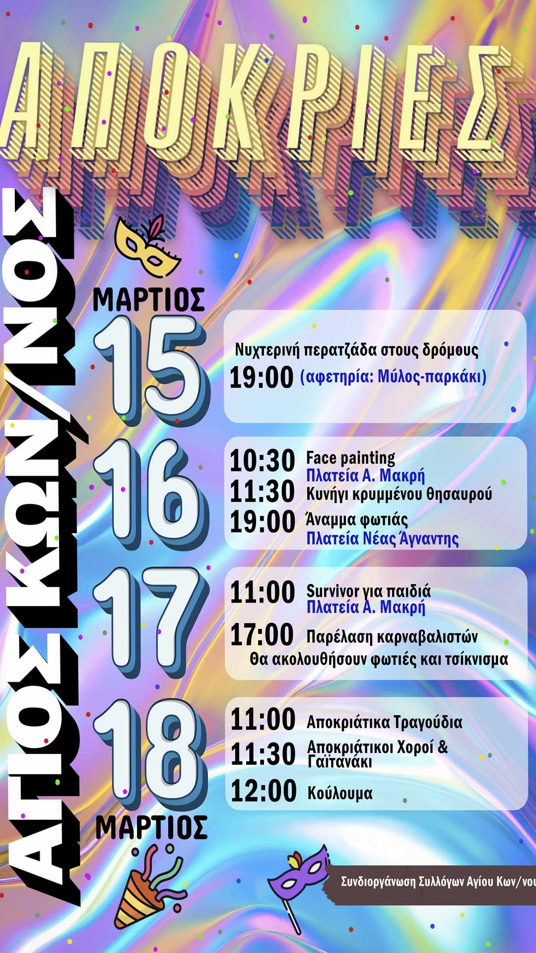 ΑΠΟΚΡΙΕΣ 2024!!! Σας περιμένουμε όλους να παίξουμε και να διασκεδάσουμε!!! #Καρναβαλι #παιχνιδια #χοροι #τραγουδια #γαιτανακια #αναμμα φωτιάς #κούλουμα Σύλλογος Επαγγελματιών Αγίου Κωνσταντίνου …